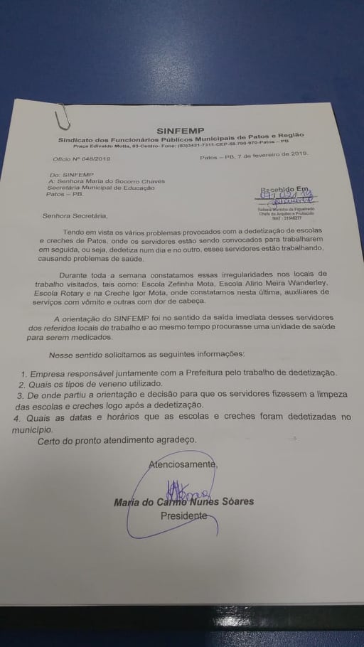 O SINFEMP (Sindicato dos Funcionários Públicos Municipais de Patos e Região) denunciou no dia de hoje que servidores municipais de Patos, especialmente as auxiliares de serviços estão sendo prejudicadas no trabalho, depois de serem convocadas pelas direções de escolas e creches que foram dedetizadas e que sequer foi dado o prazo de 72 horas para que pudessem ser feita a limpeza.