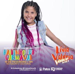 A cantora mirim participante do do The Voice Kids, Lívia Valéria, está com a sua participação confirmada no Bailinho de Carnaval da FUNDAP, no próximo dia 15 de fevereiro, às 18 horas, no Galpão Cultural da Fundação Cultural de Patos, no Jardim Queiroz, em Patos. “Tragam as crianças para brincar conosco!”, diz o texto de divulgação da FUNDAP.