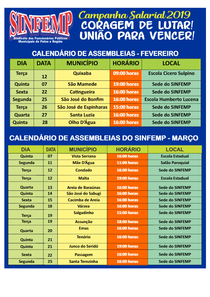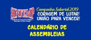Tendo em vista a mobilização de todos os seus associados, o SINFEMP definiu um calendário de assembleias que serão precedidas de visitas e mobilizações junto a base, visando discutir e encaminhar as demandas e reivindicações dos servidores em cada município.