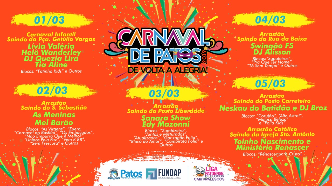 A programação segue até a próxima terça-feira (05), com a participação dos tradicionais blocos da cidade de Patos: As Virgens; Carnaval do Bastião; Vem K BB; Zumbizeira; Juntos e Misturados; Gonzagão Folia; Sapateiros; Pra Que Ter Nome; Corujão; além do Arrastão Católico ‘Renascer para Cristo’; dentre outros blocos.