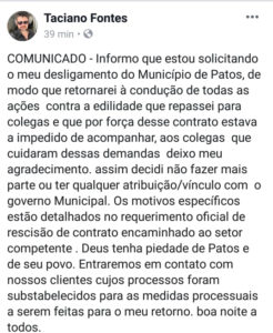 COMUNICADO – Informo que estou solicitando o meu desligamento do Município de Patos, de modo que retornarei à condução de todas as ações contra a edilidade que repassei para colegas e que por força desse contrato estava a impedido de acompanhar, aos colegas que cuidaram dessas demandas deixo meu agradecimento. assim decidi não fazer mais parte ou ter qualquer atribuição/vínculo com o governo Municipal. Os motivos específicos estão detalhados no requerimento oficial de rescisão de contrato encaminhado ao setor competente . Deus tenha piedade de Patos e de seu povo. Entraremos em contato com nossos clientes cujos processos foram substabelecidos para as medidas processuais a serem feitas para o meu retorno. boa noite a todos.