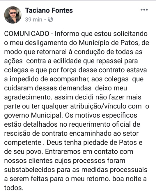 Na noite desta quinta-feira, 28, o advogado Taciano Fontes, que prestava serviços jurídicos à Prefeitura de Patos, publicou uma nota em seu perfil pessoal no Facebook comunicando o seu desligamento da administração municipal. Sem entrar em maiores detalhes, o profissional do Direito deixa no fim da nota uma frase que sugere certa insatisfação com a situação atual da cidade: “Deus tenha piedade de Patos e de seu povo”.