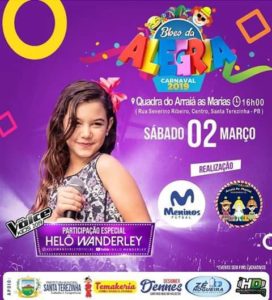 O Bloco da Alegria estará nas ruas da cidade de Santa Terezinha (PB), no sábado, 02 de março, com início às 16h, na Rua Severino Ribeiro (Rua da Lavanderia), na Quadra do Arraiá As Marias.