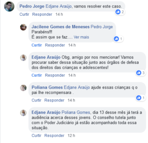 Segundo Edjane, dia 13 terá a audiência para tratar sobre a situação dos garotos. “O Conselho Tutelar junto com o Poder Judiciário já acompanham toda essa situação”, destacou. Ela também enfatizou que procurará saber da situação junto aos órgãos de defesa dos direitos das crianças e dos adolescentes.