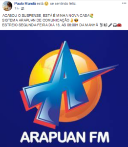 O comunicador Paulo Mandú irá comandar um programa de variedades na Rádio Arapuan FM. Ele estava como apresentador na Rádio Itatiunga FM, mas, na tarde desta quinta-feira (14) anunciou a mudança de emissora em sua rede social. O programa será estreado no dia 18.