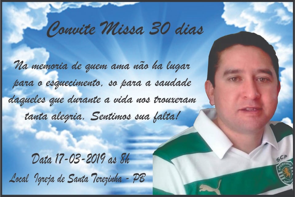 Os familiares de Iran Jerônimo dos Santos convidam parentes e amigos para a missa de 30 dias que será celebrada no próximo domingo (17) às 8 horas da manhã na Igreja de Santa Terezinha, na Grande Patos.