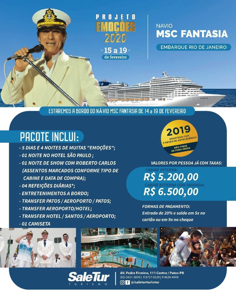 A empresa Saletur Turismo já oferece pacotes para o Projeto Emoções – Edição 2020, do cantor Roberto Carlos no navio MSC Fantasia, de 14 a 19 de fevereiro, com embarque no Rio de Janeiro.