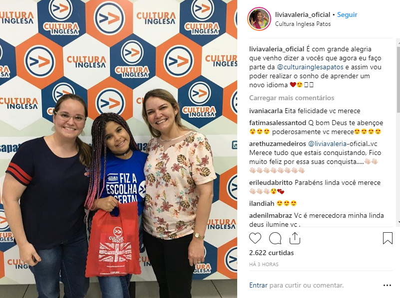 A cantora mirim patoense Lívia Valéria, de 12 anos, uma das grandes revelações do The Voice Kids 2019 vai cursar inglês na Cultura Inglesa, em Patos, e comemorou nas redes sociais: “É com grande alegria que venho dizer a vocês que agora eu faço parte da Cultura Inglesa Patos e assim vou poder realizar o sonho de aprender um novo idioma”.