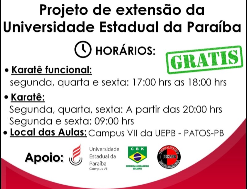 O projeto de extensão Askaki Sertão, da Universidade Estadual da Paraíba, do campus de Patos, oferece gratuitamente aulas de karatê tanto para os alunos da instituição, como também para a população em geral.
