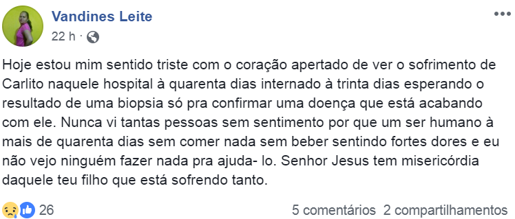 Vandinês disse que foi até o laboratório e, chegando lá, informaram que quarta à tarde ou quinta pela manhã o resultado estaria no hospital, mas hoje já é sábado (23) e ainda não foi enviado. O senhor está há cerca de quarenta dias sem comer e sem beber e perdendo muito sangue pela boca. “É muito triste você ver um ser humano morrendo de fome e sede e sentindo fortes dores na garganta e não poder fazer nada”, disse Vandinês.
