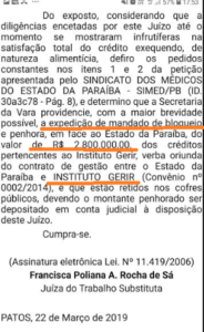 A decisão judicial atende pedido de “cumprimento provisório de sentença com reforço de cumprimento de liminar ratificada na sentença e bloqueio de créditos”, em processo inciado com uma Ação ajuizada pelo Sindicato dos Médicos da Paraíba, em razão de uma série de descumprimentos de obrigações trabalhistas por parte do Instituto Gerir contratado pelo Governo do Estado para administrar a Maternidade Peregrino Filho.