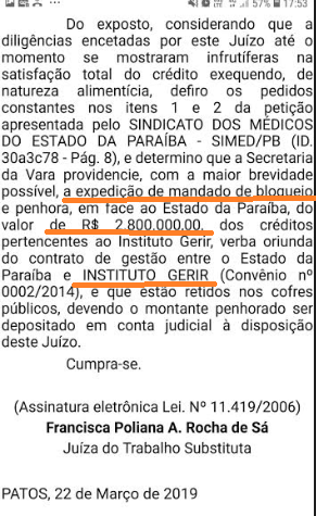 A juíza Francisca Poliana Rocha de Sá, da Vara do Trabalho da cidade de Patos, determinou o bloqueio e penhora do montante de R$ 2,8 milhões dos cofres do Governo do Estado, quantia referente a créditos a receber do Instituto Gerir, para garantia de pagamento de dívidas trabalhistas da Organização Social com médicos e outros profissionais que trabalham na Maternidade Doutor Peregrino Filho, na cidade de Patos.