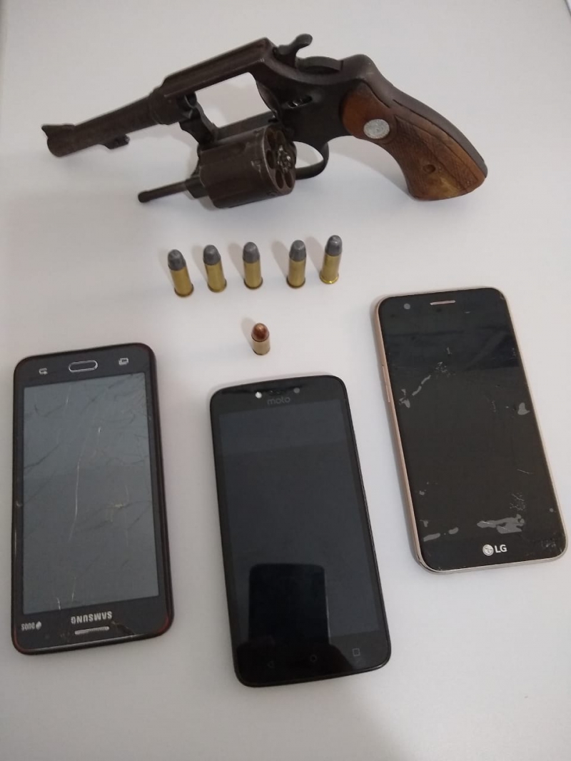 Realizada uma busca no interior do veiculo Fox branco, foram encontrados três aparelhos celulares e uma munição intacta de calibre 9 mm.