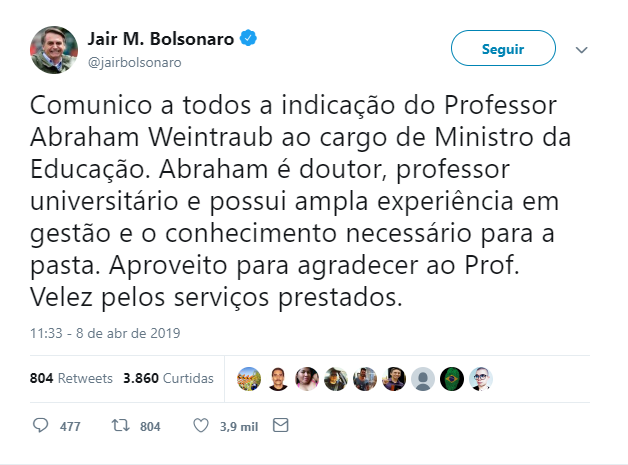 Ainda de acordo com Bolsonaro, o novo ministro será Abraham Weintraub. Ele já integra o Governo e tem formação na área de Economia.