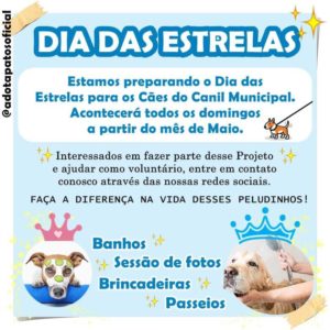 A ONG Adota Patos está preparando o Dia das Estrelas para os cães do Canil Municipal, que fica no bairro Alto da Tubiba, próximo ao Instituto Federal de Educação, Ciência e Tecnologia da Paraíba (IFPB), na saída para Teixeira.
