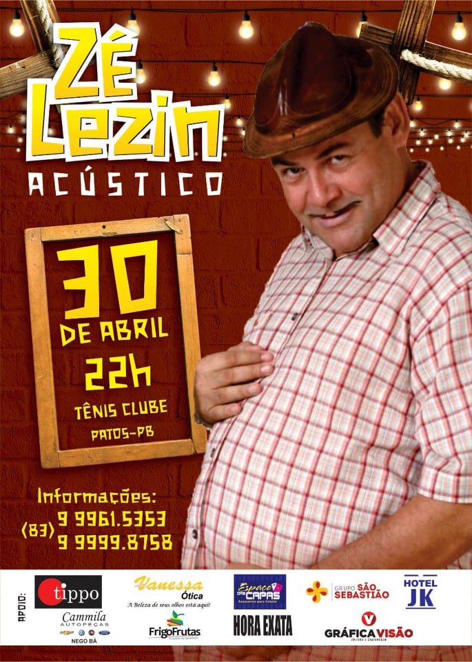 No dia 30 de abril, uma terça-feira, a partir das 21 horas, no Patos Tênis Clube, o humorista Zé Lezin estará apresentando o seu novo show: “Zé Lezin Acústico”.