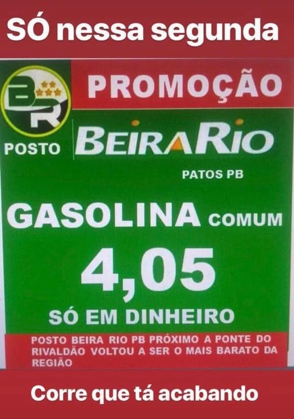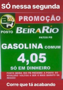 Encerra nesta segunda-feira, 15, a promoção do Posto Beira Rio, localizado próximo à Ponte do Salgadinho, na Brasília, em Patos. Aproveite e compre gasolina a R$ 4,05, mas só a dinheiro.