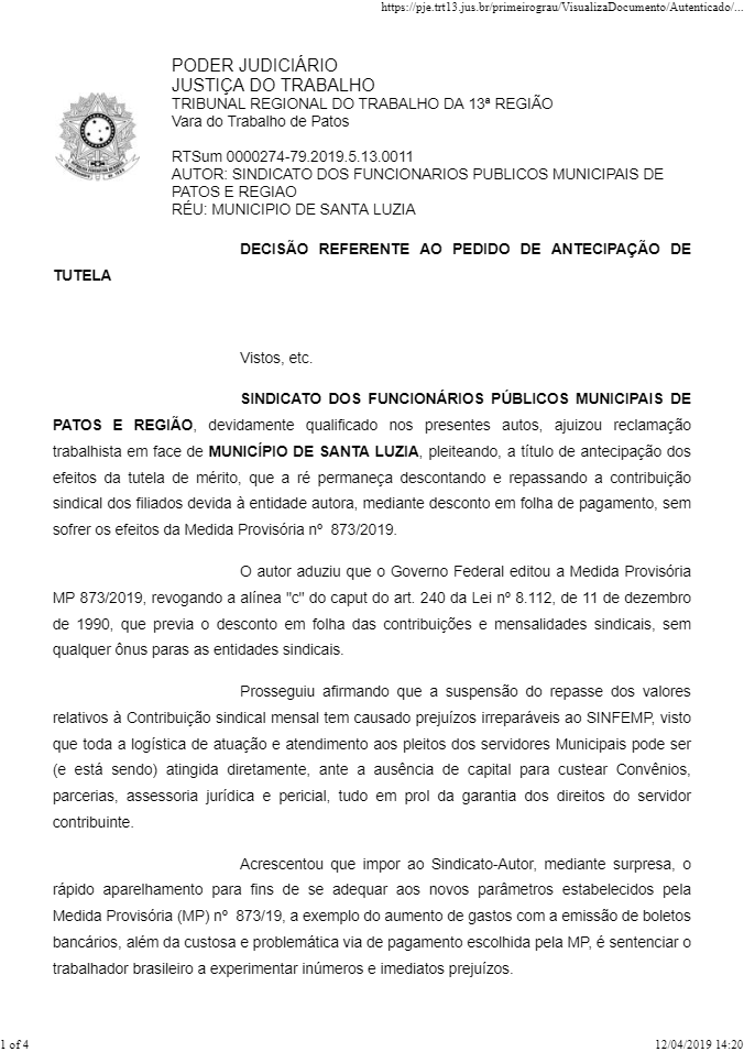 O SINFEMP entrou com reclamação trabalhista com pedido de urgência, na modalidade de tutela antecipada, junto ao Tribunal Regional do Trabalho da 13ª Região, Vara do Trabalho de Patos, conforme RTSum 0000274-79.2019.5.13.0011, onde foi concedida a Antecipação de Tutela pela Juíza do Trabalho Substituta, Francisca Poliana Aristóteles Rocha de Sá neste dia 12 de abril de 2019.