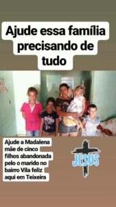 Dona Madalena, de 40 anos, tem cinco filhos (de 2, 6, 9, 12 e uma moça de 18 anos) e foi deixada pelo marido, de forma que a situação dela é de extrema necessidade. Ela recebe bolsa família, mas o valor é insuficiente para as muitas despesas da casa.
