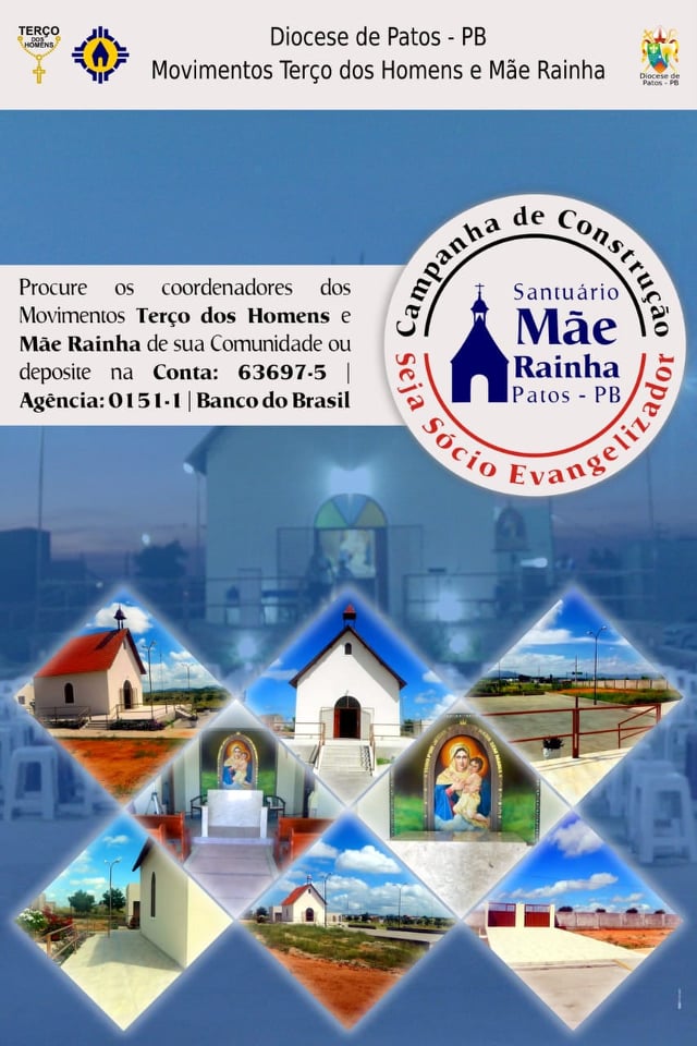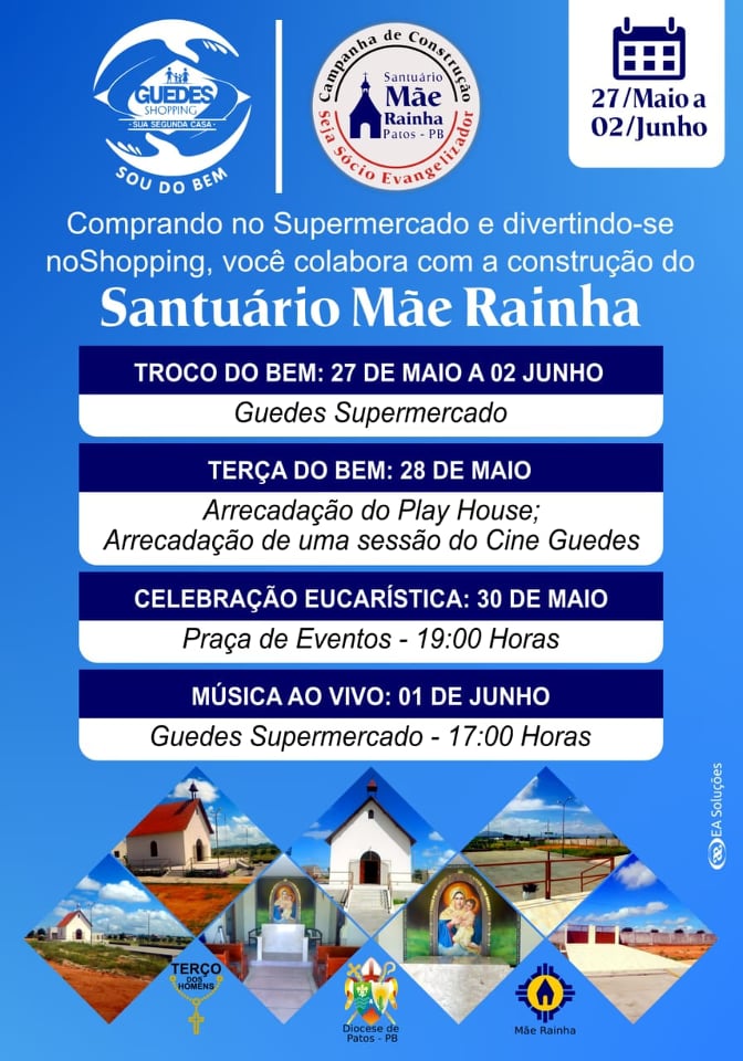 A coordenação do Santuário faz um apelo para a generosidade de todos que comparecerem ao Supermercado Guedes nesta semana para realização de suas compras, e na noite da terça no play house e na sessão do Cine Guedes, tendo em vista que as arrecadações serão em prol deste grande projeto evangelizador da Diocese de Patos.