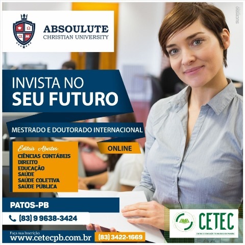 O Centro de Educação Tecnológica da Paraíba – CETEC/Patos, em parceria com a Absoulute Christian University, oferece Mestrado e Doutorado nas áreas de Educação, Saúde, Direito e Ciências Contábeis, totalmente online.