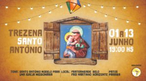 Acontece a partir das 19 horas, de 1º a 13 de junho, na sede da Ordem Franciscana Secular Fraternidade Frei Martinho, na Rua Horácio Nóbrega, 575, próximo à panificadora Shopping Pão, no bairro Belo Horizonte, em Patos, a Trezena de Santo Antônio, este ano com o tema “Santo Antônio modelo para uma igreja missionária”.