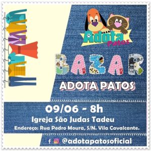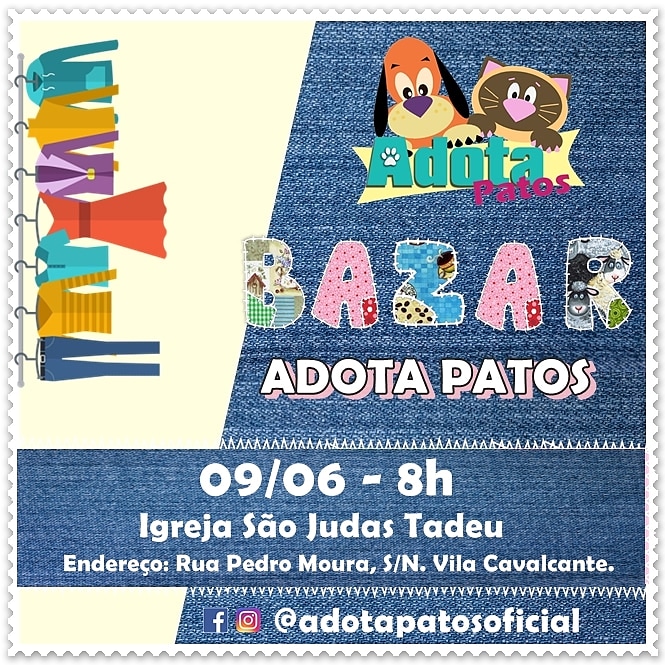 No próximo domingo (09), a partir das 8 horas, a ONG Adota Patos promove um bazar na Igreja São Judas Tadeu, na Rua Pedro Moura, s/n, no bairro Vila Cavalcante, em Patos.
