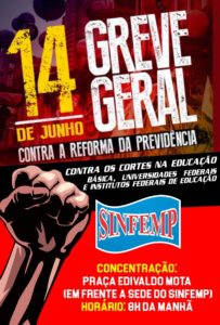 Em reunião realizada da Frente Brasil Popular em Patos e demais entidades dos movimentos sociais e sindicatos, ficou definida a atividade no dia 14 de junho de 2019, sexta, na Greve Geral contra a Reforma da Previdência do governo Bolsonaro, contra os cortes de verbas na educação e pela democracia no Brasil.