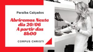 Nesta quinta-feira, 20 de junho, feriado de Corpus Christi, a loja Paraíba Calçados estará com suas portas abertas e com muitos lançamentos em calçados e bolsas.