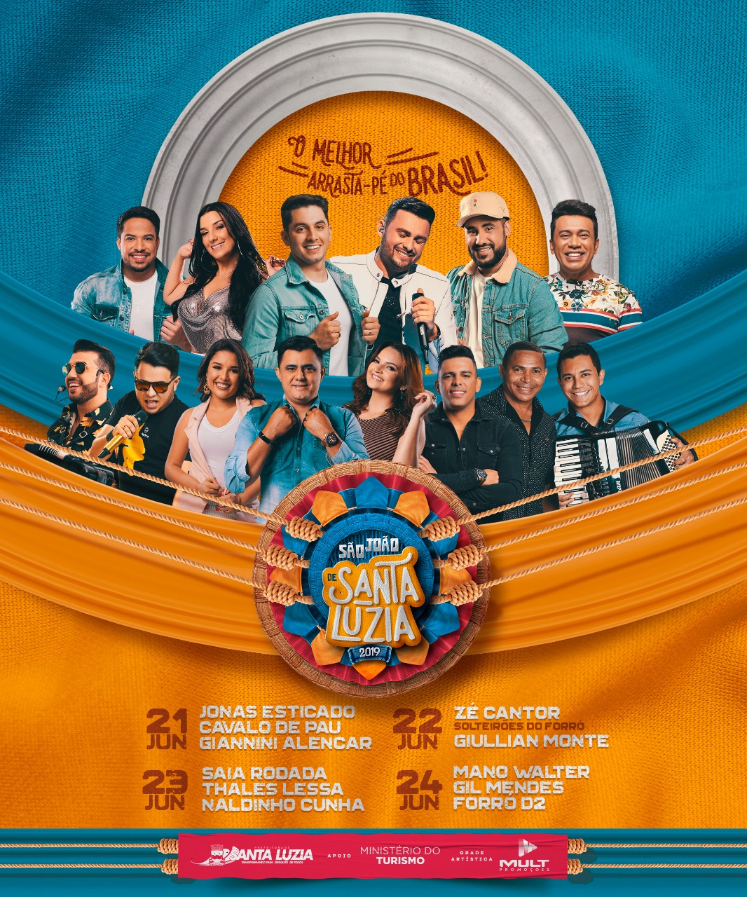 A programação 2019 do São João de Santa Luzia conta com as apresentações dos cantores Mano Walter, Jonas Esticado, Zé Cantor e Solteirões do Forró, Giullian Monte e Gil Mendes; e das bandas Saia Rodada, Cavalo de Pau e Forró D2, entre outras atrações. Também se apresentarão artistas da terra e membros da cultura popular local.