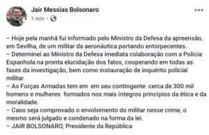 “Determinei ao ministro da Defesa imediata colaboração com a polícia espanhola na pronta investigação dos fatos, cooperando em todas as fases da investigação, bem como instauração de inquérito policial militar”, escreveu Bolsonaro.