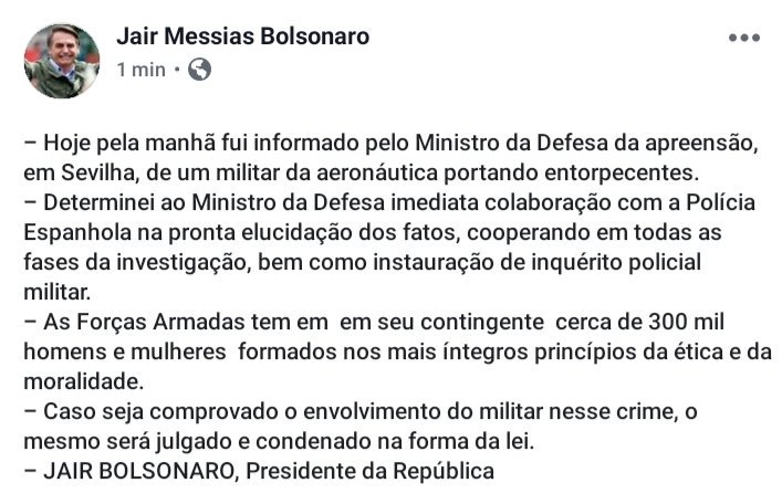 O presidente Jair Bolsonaro publicou nota em sua conta oficial no Twitter hoje (25) confirmando a prisão de um militar brasileiro no aeroporto de Sevilha, na Espanha, suspeito de transportar entorpecentes. O nome do militar, que pertence à Aeronáutica, não foi informado. Segundo informações do Comando da Aeronáutica, ele estava em uma aeronave da Força Aérea Brasileira (FAB).