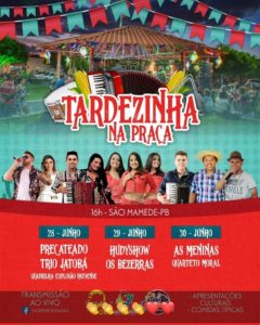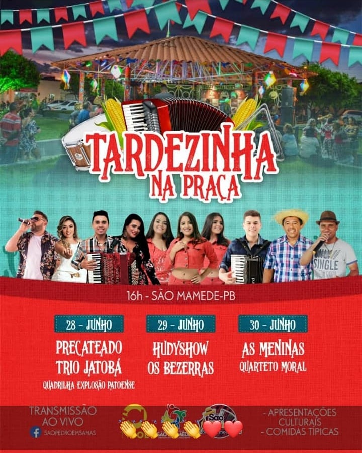 Começa a partir das 16 horas desta sexta-feira, 28, e vai até o domingo (30), o evento Tardezinha na Praça, dentro dos festejos do tradicional São Pedro do município São Mamede, com apresentações culturais e comidas típicas.