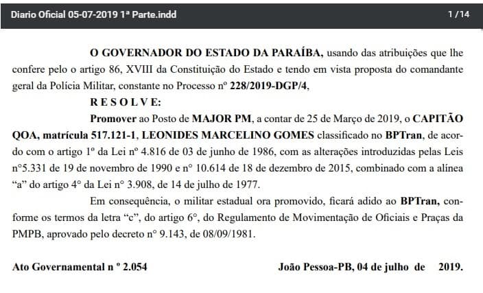 O comandante da 4ª Companhia de Policiamento de Trânsito (4ª CPTRAN), em Patos, Capitão Leonides Marcelino, ascendeu ao posto de major da Polícia Militar conforme publicação no Diário Oficial do Estado da Paraíba deste sexta-feira (05). Ele fez um agradecimento nas redes sociais: “Quero agradecer a Deus por me conceder mais esta graça e benção em minha vida e a todos que durante minha trajetória contribuíram direta ou indiretamente com essa conquista”.