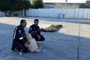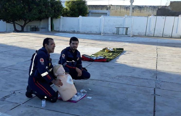 Para conduzir o treinamento e as instruções repassadas, estiveram presentes Cleston Camboim, Coordenador do Núcleo de Educação em Urgência (NEU), e o socorrista Lucas Marques, ambos do SAMU 192 – Regional de Patos.