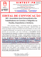 O Sindicato dos Trabalhadores em Correios e Telégrafos na Paraíba (SINTECT-PB) realiza nesta quarta-feira (31), uma assembleia geral com toda a categoria, com o objetivo de deliberar por uma greve no estado, a partir da 00h, desta quinta-feira (1º).