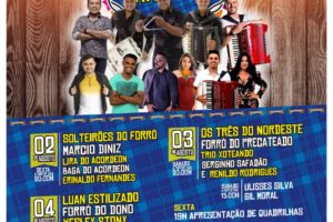 No primeiro dia de evento a animação ficará por conta do artista em ascensão Zé Cantor e, ainda, Márcio Diniz, Lira do Acordeom, Baga do Acordeom e Erinaldo Fernandes, no segundo dia de festa, (03), será a vez da banda Os Três do Nordeste, Forró do Precateado, Trio Xoteando, Serginho Safadão e Renildo Rodrigues. E no domingo, dia (04), para fechar com chave de ouro, a festa será comandada por Luan Estilizado, forró do Dono, Wesley Stony e Pegada Sertaneja. Todas as atrações começarão a se apresentar a partir das 20h.