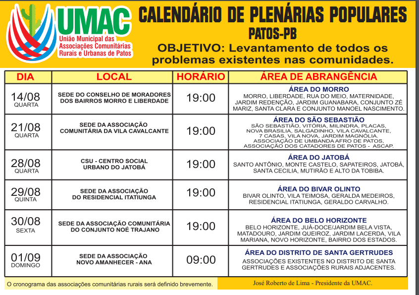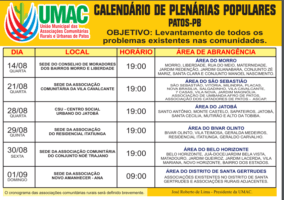 A UMAC (União Municipal das Associações Comunitárias Rurais e Urbanas de Patos) definiu um calendário de plenárias populares com o objetivo de identificar os graves problemas que afligem o povo, as comunidades no geral.