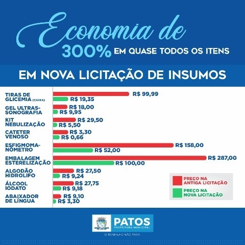 A Prefeitura de Patos realizou, nesta quinta-feira, dia 08 de agosto, uma licitação de insumos hospitalares que irá gerar mais de 300% de economia na compra da maioria dos itens. O setor de licitação informou que a última licitação tinha ocorrido em 2017.