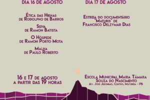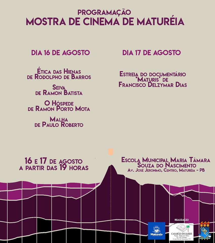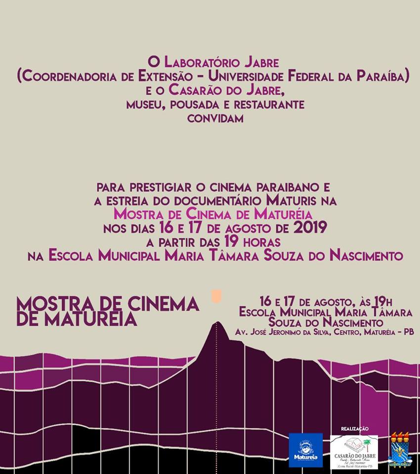 Começa às 19 horas desta sexta-feira, 16 e segue até o sábado, 17, a Mostra de Cinema de Maturéia, que acontece na Escola Municipal Maria Tâmara Souza do Nascimento, que fica na Avenida José Jerônimo, no centro da cidade. O evento é uma realização do Laboratório Jabre de Atuação e Direção de Elenco (Coordenadoria de Extensão da Universidade Federal da Paraíba), Casarão do Jabre e Prefeitura Municipal de Maturéia.