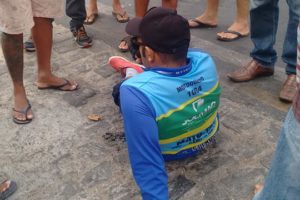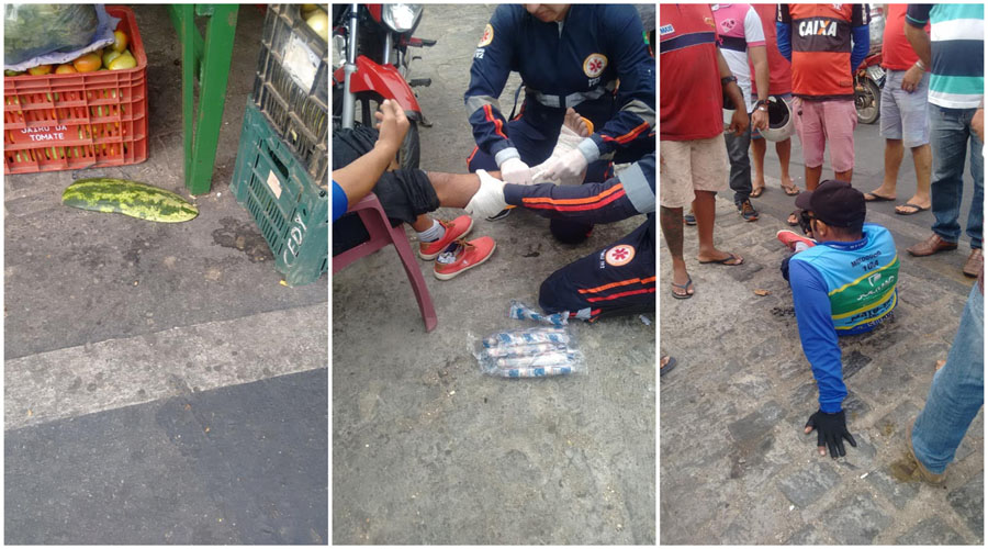 Por volta das 7 horas desta sexta-feira, 16, na Rua Pedro Firmino, próximo ao Mercado Público de Patos, um mototaxista de nome Mauro, da praça do Bivar Olinto, trafegava em sua moto quando o pneu dianteiro derrapou numa casca de melancia jogada no meio da rua.