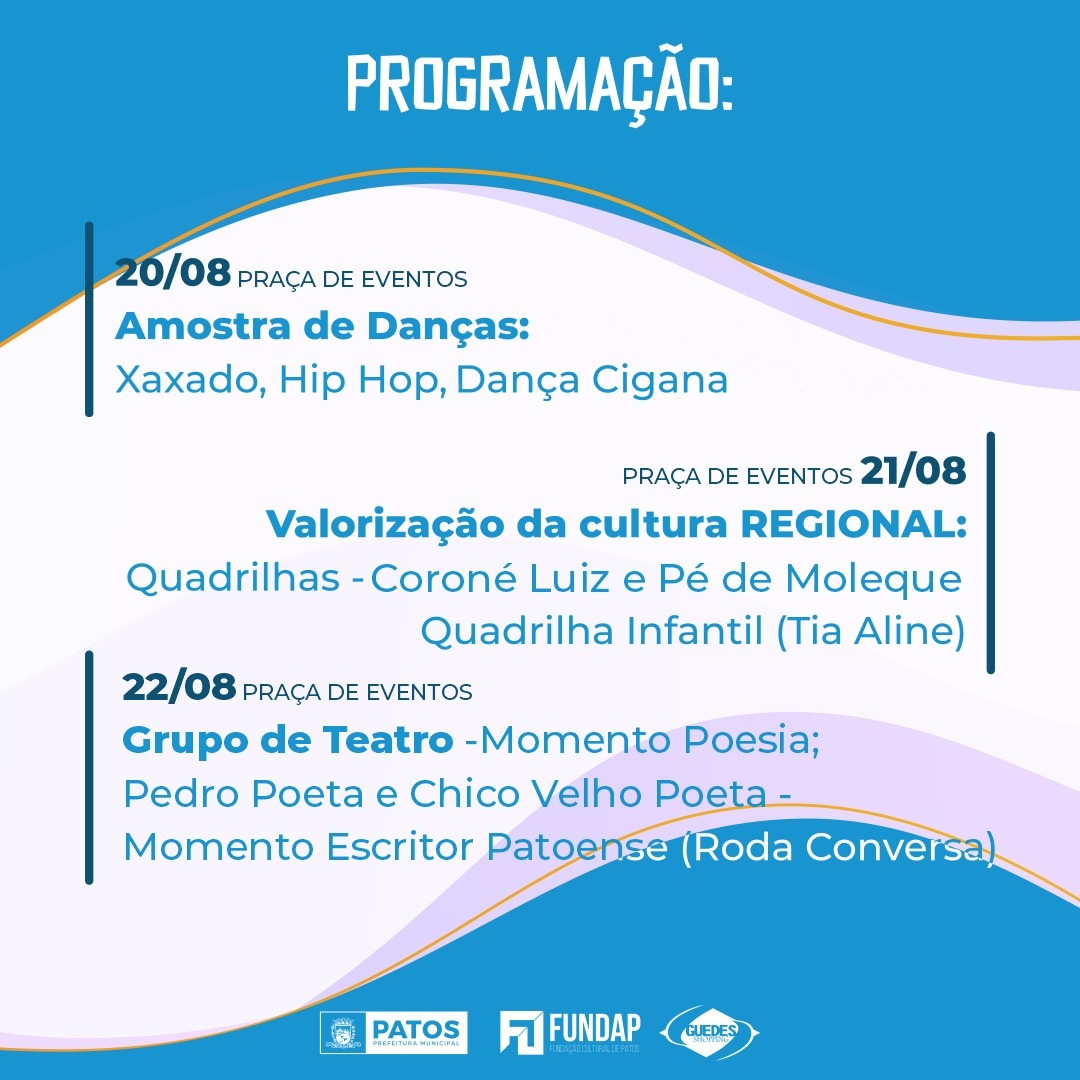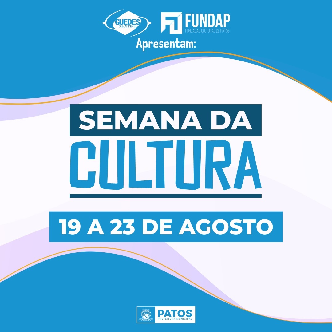 No dia de hoje, na Praça de Eventos, tem apresentações da Filarmônica 26 de Julho, Coral Municipal, Projeto de Inclusão Social através da Música e das Artes (PRIMA) e Orquestra de Violões da Universidade Estadual da Paraíba (UEPB). A Semana Cultural é uma realização da Prefeitura Municipal de Patos, por meio da Fundação Cultural de Patos (FUNDAP), e do Guedes Shopping.