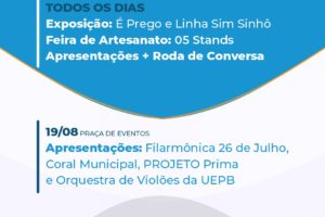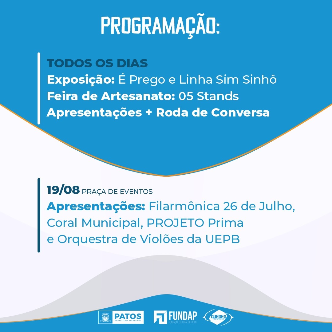 Começa nesta segunda-feira, 19, e segue até a próxima sexta-feira, 23, no Guedes Shopping Center, no centro de Patos, o evento Semana Cultural, com uma programação cheia de diversidade e cultura para toda a população patoense. Todos os dias terá a exposição “É Prego e Linha Sim Sinhô”, feira de artesanato com cinco stands e apresentações mais roda de conversa.