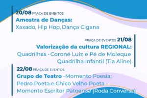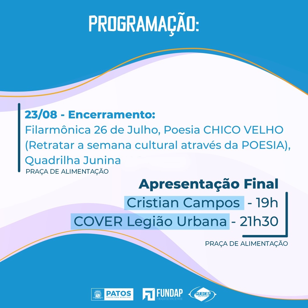 Encerramento: Filarmônica 26 de julho, Poesia Chico Velho (retratar a semana cultural através de poesia), quadrilha junina e apresentação final de Cristian Campos (às 19 horas) e Cover de Legião Urbana (às 21h30min).