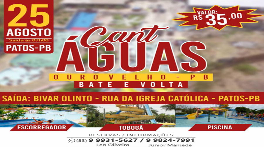 A empresa Rota Turismo estará com ônibus saindo de Patos no próximo domingo, 25, com destino ao Parque Aquático Cant’Águas, em Ouro Velho, município situado na região do Cariri Paraibano. O valor é R$ 35,00, ida e volta.