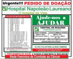 O Hospital Napoleão Laureano, em João Pessoa, está precisando de doações, seja em dinheiro ou em materiais. “Antecipadamente agradecemos suas doações”, disseram o coordenador do Serviço da Farmácia do Hospital, Jadson Gomes Dantas, e surpevisor do Central de Abastecimento Farmacêutico (CAF) do Hospital, Hailton Diniz Simão.