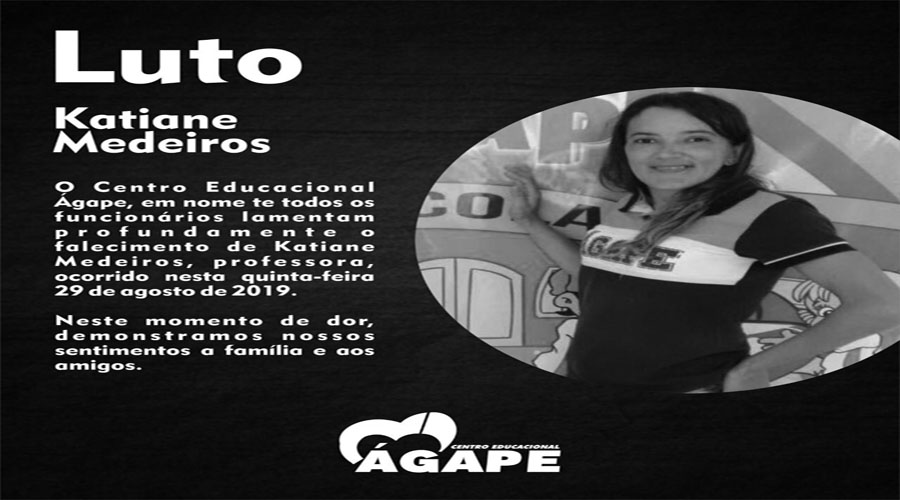 O Centro Educacional Ágape, em nome de todos os funcionários, lamenta profundamente o falecimento de Katiane Medeiros, professora, ocorrido nesta quinta-feira, 29 de agosto de 2019.