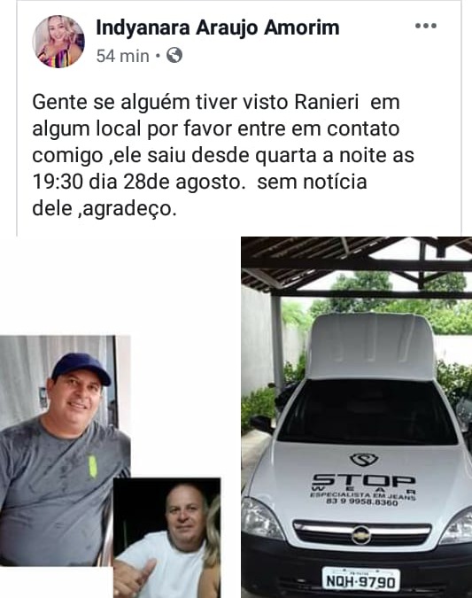 Qualquer informação ligue para Indyanara Araujo Amorim (esposa), pelo telefone (83) 9.9846-1415. “Agradecemos de coração a ajuda de cada um. Se alguém tiver alguma informação sobre o paradeiro da Raniere, por favor, entre em contato”, diz ela.