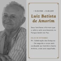 Morreu por volta das 12h40min deste sábado, 31, de insuficiência cardíaca, no Complexo Hospitalar Regional de Patos, o fundador da indústria de doces Sabor do Sertão, Luiz Batista Amorim, conhecido como Luizão, de 79 anos, residente no bairro da Liberdade, em Patos.