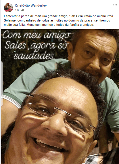 O empresário Cristovão Wanderley, proprietário da Gramado Import, em Patos, fez o seguinte comentário nas redes sociais: “Lamentar a perda de mais um grande amigo. Sales era irmão de minha irmã Solange, companheiro de todas as noites no dominó da praça, sentiremos muito sua falta. Meus sentimentos a todos da família e amigos“.